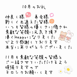 こんにちは 2025/11/01 16:32:30 こんにちは 昨夜お誘いいただいた仲良し様✨️✨️ ✩訪問した際に 懐かしいアイドルのお話で ちょっとイン遅れちゃいました😆 いつもと少し雰囲気変わって 大興奮しちゃいましたね🤭 いつも癒しのお時間を ありがとうございます😊 ✩見つけて下さりお誘い 嬉しかったです♪♪♪ ドリンクにチョコレート 白い恋人ご馳走様でした😋 凄くほんわかした 楽しいお時間でした😊 本当にありがとうございました 本日20時〜3時で出勤いたします 優しいお誘いお待ちしております⭐️ ヨロシクお願いします🌻
